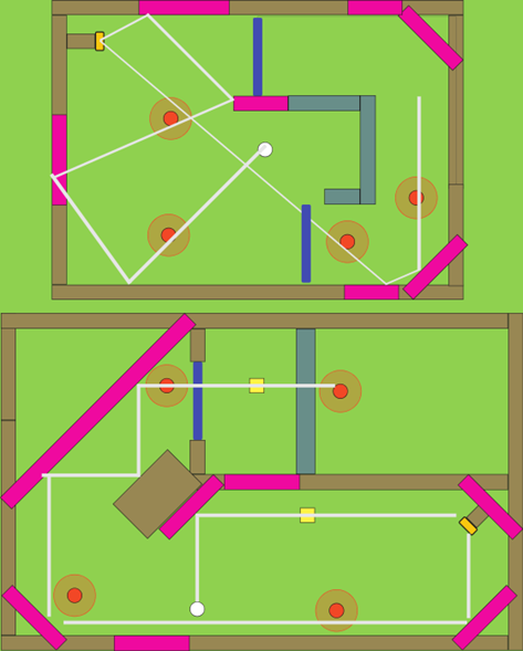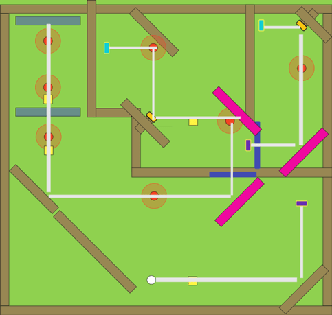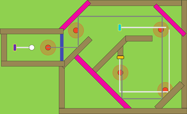 Later, during playtests my teammates and I found many designed shots ended up not in the intended position while people always have different strategies than the designer. And we concluded after discussion that designing smaller levels, which can be completed in one shot, would help to enlarge the fun and the sense of achievement. So, in the later milestone, I iterated the previous levels into smaller pieces. Also we changed the limited shots strategy to par system that provides less frustration for the player to exploring a better solution.