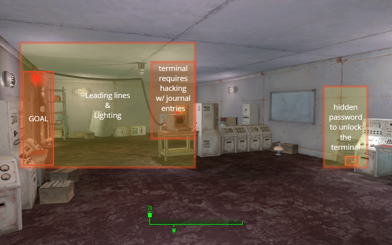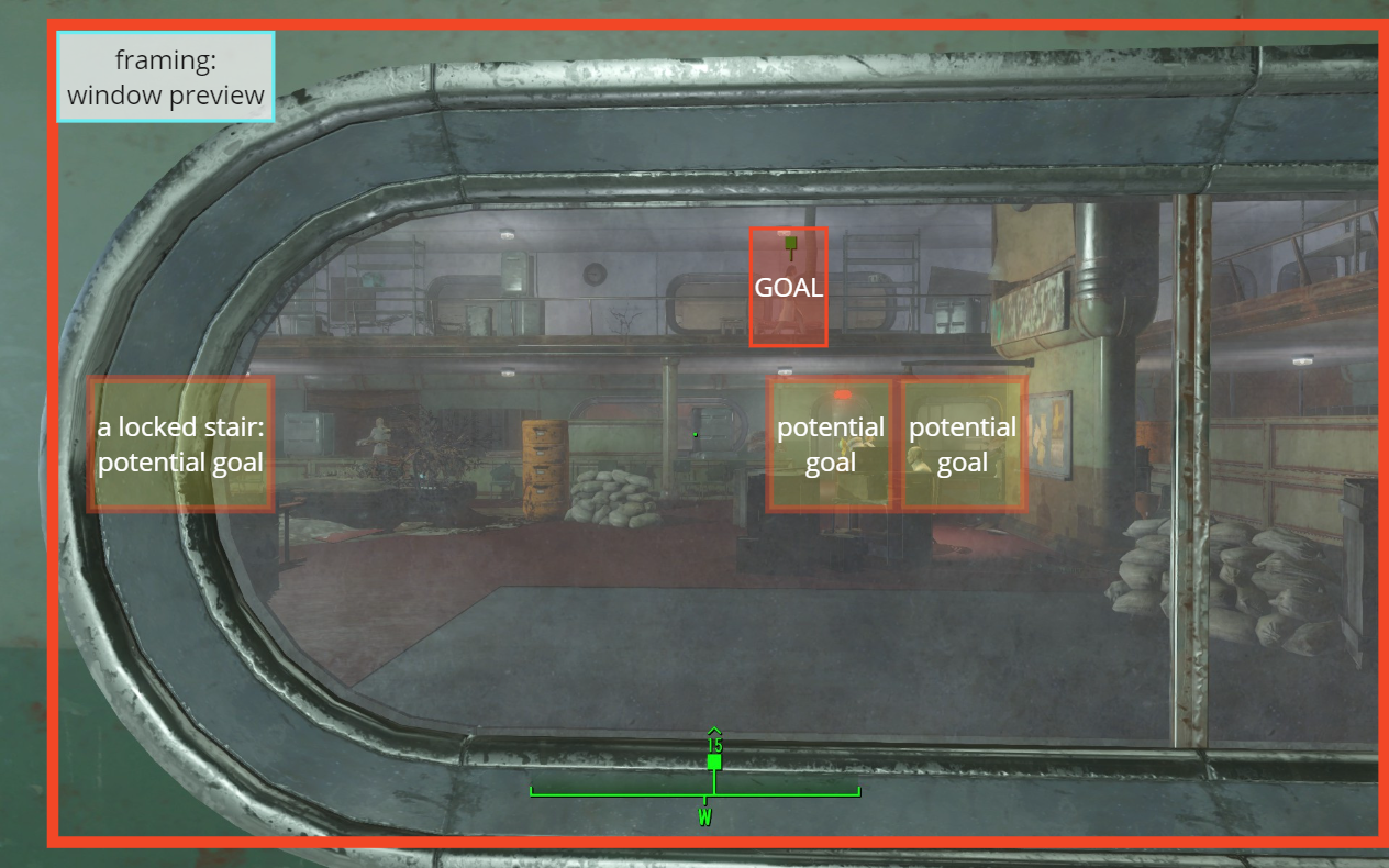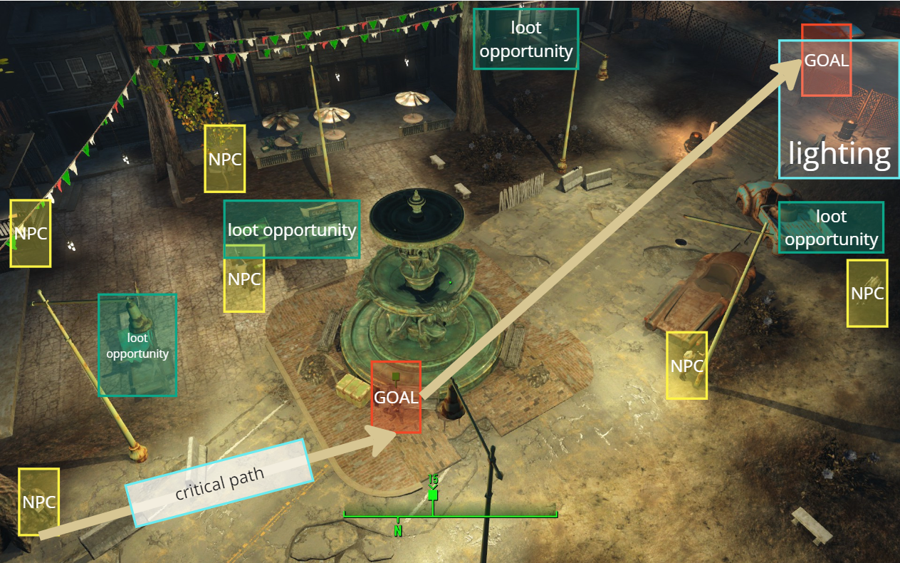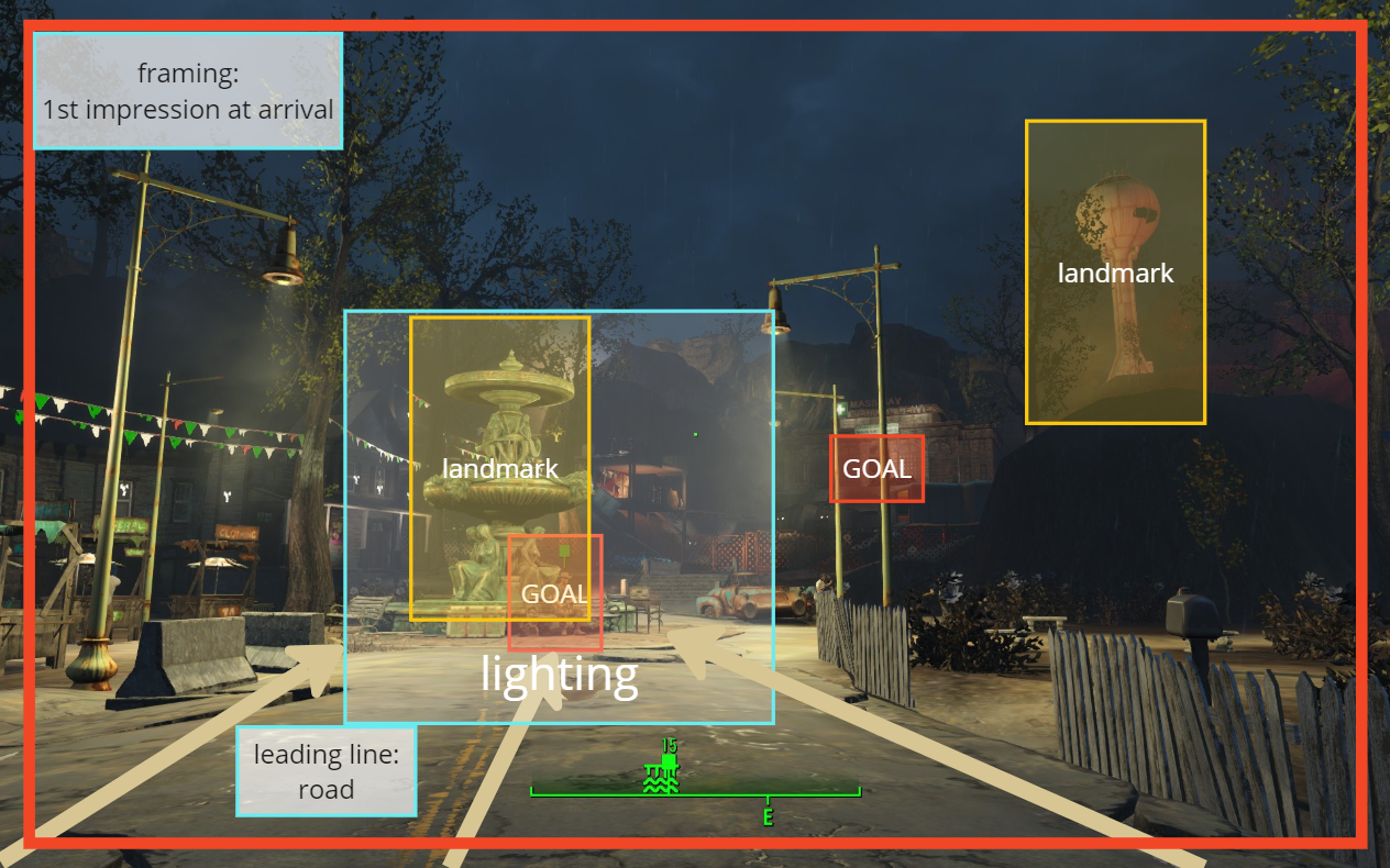 A broad objective that can be seen in distance, allows the player to find the path to get near as they explore by good conveyance.