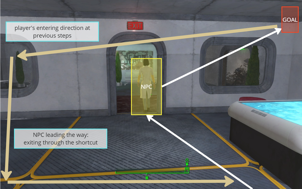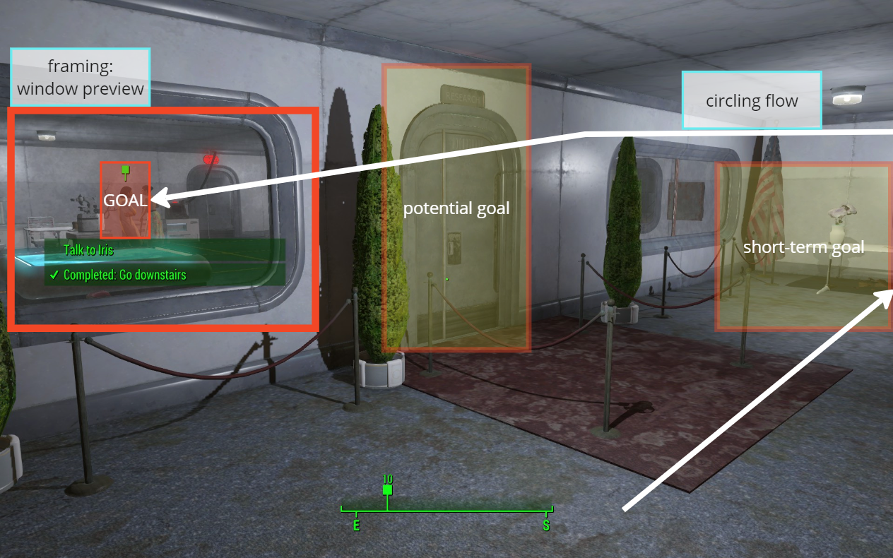 The level features multiple shortcut doors that enable players to revisit previously explored areas. This design allows players to easily return if they have unfinished optional objectives. When a shortcut is revealed, memorable visuals are strategically placed to remind players of their location, enhancing their navigation experience and encouraging exploration.