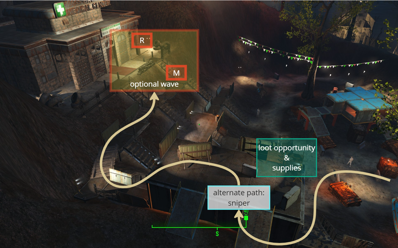 - The exterior combat space is designed with long-range enemy placements to encourage the use of the sniper mod on the combat rifle. Additionally, an alternate path is provided, offering players sniper options to take down enemies from a distance, enhancing strategic gameplay.