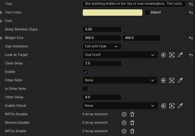 From the exposed properties in the note trigger, I can adjust text color, font, paragraph size, and animations to create varied visuals that align with different gameplay themes.