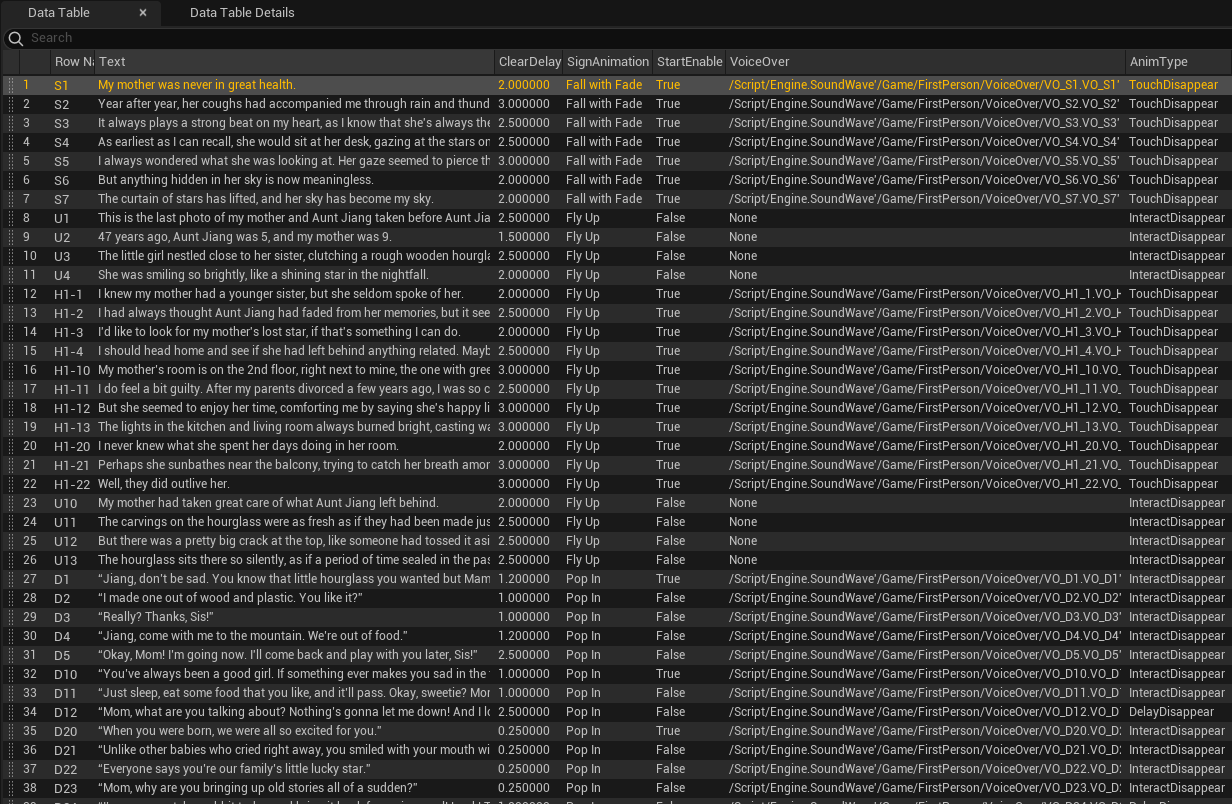 All the narrative lines are stored in a data table, including the actual line, row name (grouped into different sections according to their locations in the level), clear delay, text animation type, start status, voice-over file, and more.